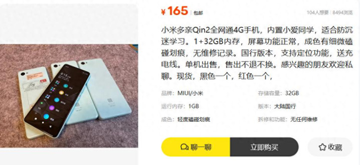 小米生态链出的多亲Qin2手机,当年首发价499元,现在只要165块, 内置小爱同学,除此之外还能打电话、能定位的全网通4G手机。如今在二手鱼上卖165块,这就是妥妥的戒网神器和老年机啊。
